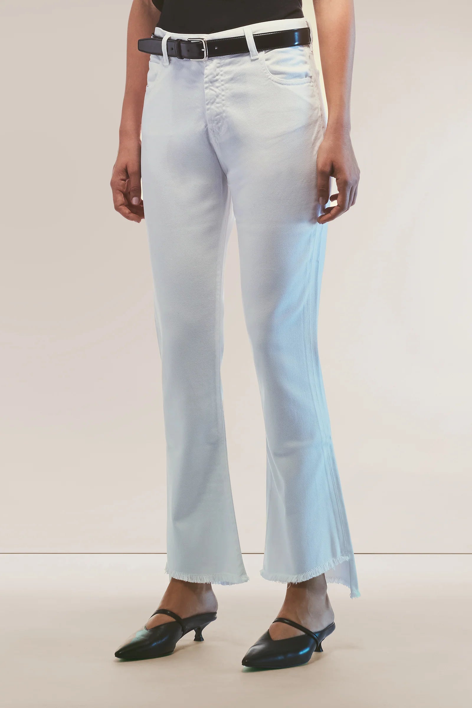 Jeans flare cinque tasche in gabardina smerigliata, vita regolare, fascione in vita con passanti, chiusura frontale con zip e bottone, fondo asimmetrico sfrangiato, carrÃè posteriore con tasche a toppa 73% TENCEL 25% COTONE 2% ELASTANMade in ITALYVestibilità Regolare