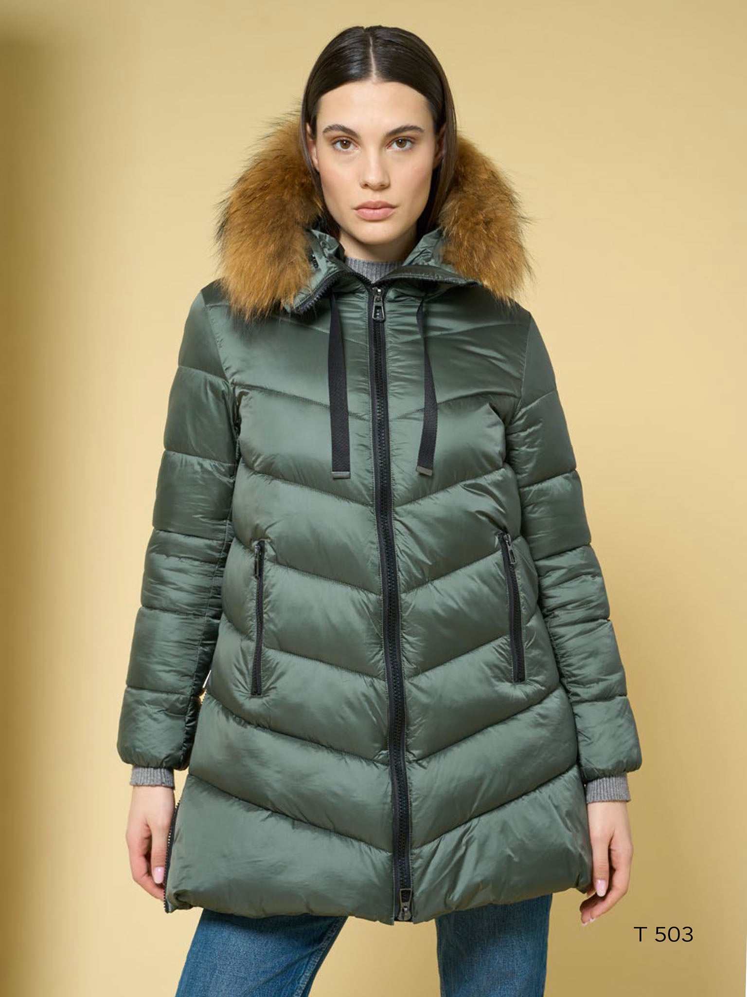 Piumino midi con collo pelliccia.