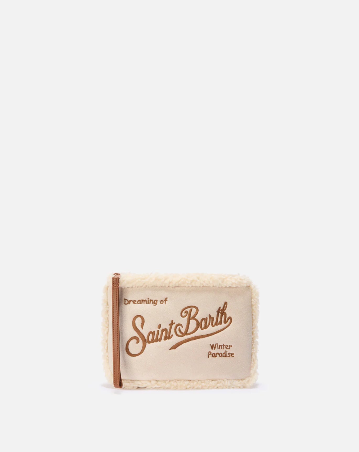 Avvolgente e versatile: beige e shearling per uno stile elegante e informale.Pochette tessuto scuba, sherpa e faux suedeTinta unita beigePassante per polso in gros-grainLogo ricamatoDimensioni: 21 x 15,5 x 7 cm