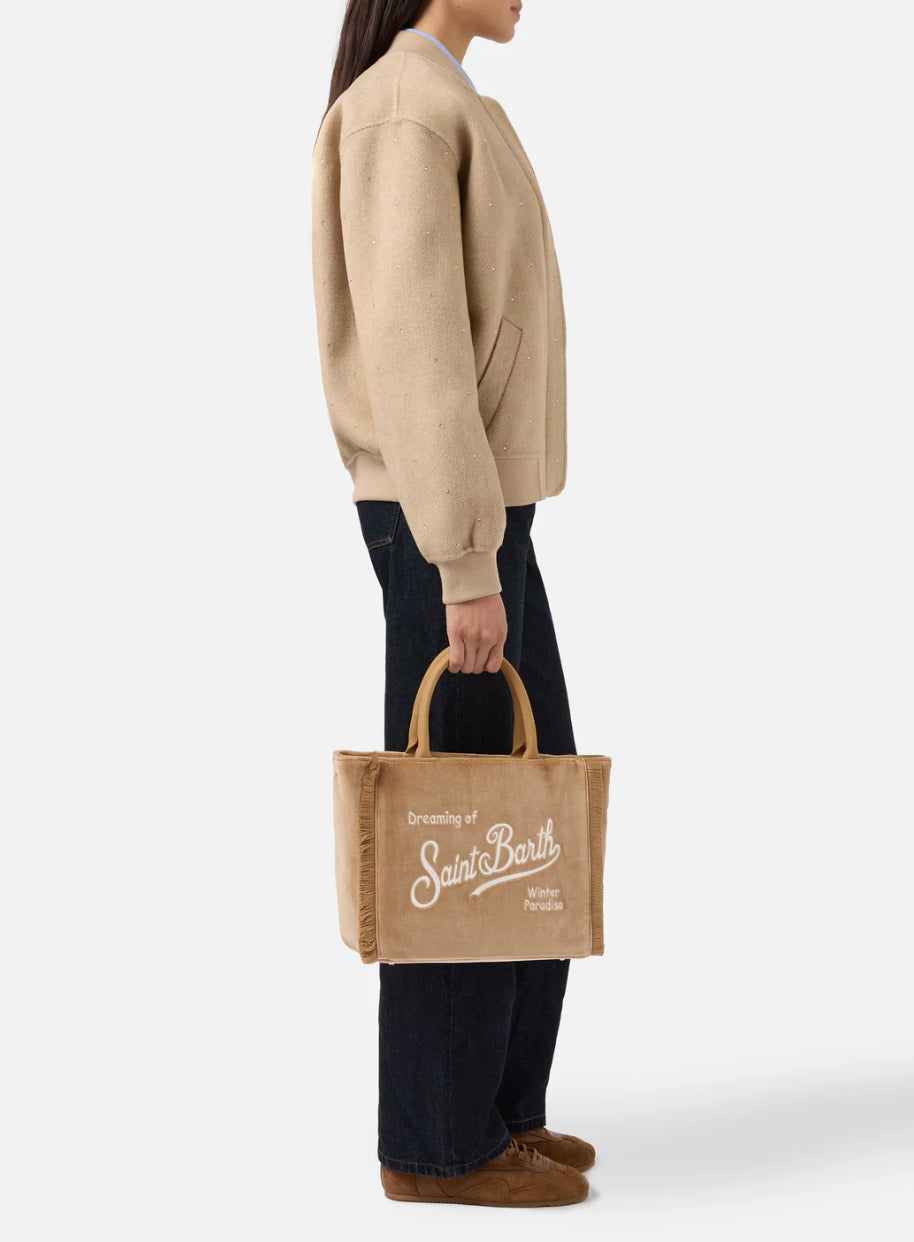 Texture morbida e sofisticata: il velluto dona un’eleganza discreta e perfetta per ogni occasione.Borsa a mano in vellutoTracolla regolabile e removibileTinta unita beigeTasca internaLogo ricamatoDimensioni: 27 x 25 x 14 cm